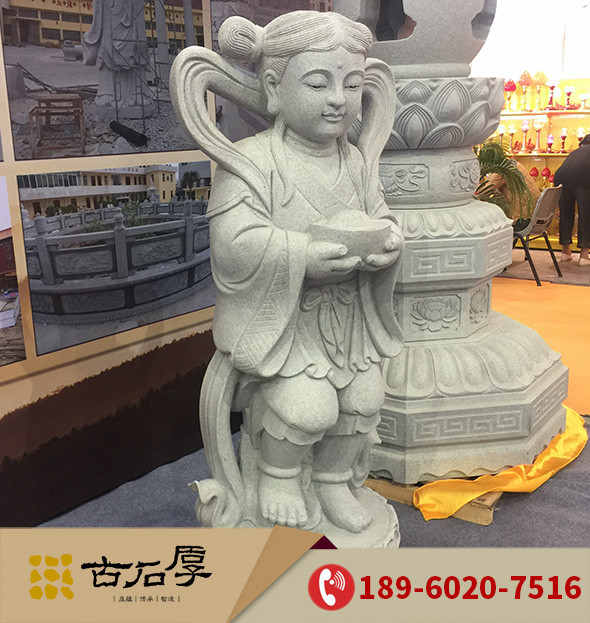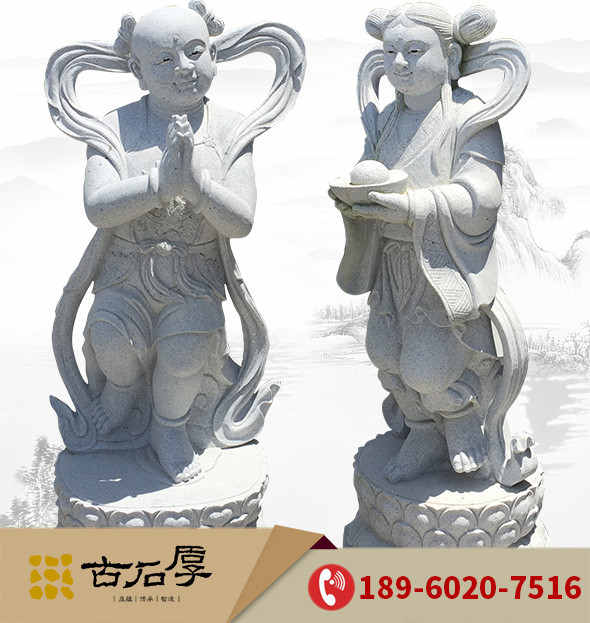 石雕金童玉女,他們代表的是吉祥和如意,因此,廣受民間百姓歡迎。金童玉女指的是他們的外表形象,也是泛指的表面的寓意,引申意是,男才女貌的意思,是用來形容外表形象比較般配的男女。當然,石雕金童玉女的最佳擺放位置是在光線亮、空氣好、方便禮拜,自認為是家里最好的位置。