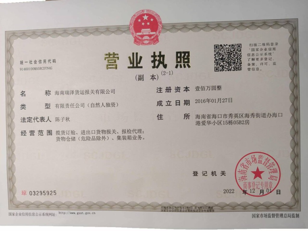 海南瑞澤貨運報關(guān)有限公司