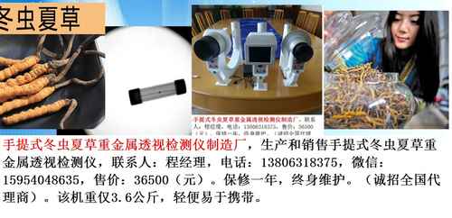 手提式冬蟲夏草重金屬透視檢測儀制造廠,生產和銷售手提式冬蟲夏草重金屬透視檢測儀,聯系人:程經理,電話:13806318375,微信:15954048635,售價:36500(元)。保修一年,終身維護。(誠招全國代理商)。該機重僅3.6公斤,輕便易于攜帶。更多詳情,登陸公司網站:http://www.jdzj.com/jiage/3_78264758.html。,,,,,,,,,,,手提式冬蟲夏草重金屬透視儀主要用在冬蟲夏草收購中,透視混在蟲草中的重金屬,一按按鈕就可看到蟲草中的重金屬。該機有三大優點:1,重量輕,僅3.2公斤重.一個手就能提的動。2,采用影像增強的工作原理,X射線量極低,僅有0。5mA對人沒傷害。3,熒光屏成像,無需暗室,一按按鈕就可看到。蟲草中的重金屬該機視野為直徑50mm的熒光屏。圖像為草綠色帶點雪花點,可帶蓄電池,可在野外用。是國內**能夠快速,便捷的檢測出冬蟲夏草里重金屬而又對人沒傷害的的儀器。