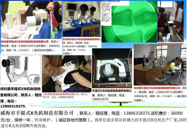 威海市手提式X光機制造有限公司,聯系人:程經理,電話:13806318375.生產和銷售低劑量手提式X光機,該機售價:36000元/臺,便攜式高清DR檢視儀,售價:25萬元/臺,保修一年,終身維護,無需暗室,一按按鈕就能看到骨頭。低劑量手提式X光機是我單位最早開發研制的高新技術產品,是目前國內外最小的X射線診斷設備.我單位是全國目前最大的便攜式X光機專業生產廠家,三證齊全,品牌:厚華。同時進行X光機的DR升級改造。,(誠征各地代理商).該機僅重3.6公斤,一個手就提得動,